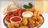 Buffalo wings, mozzarella sticks, jalapeno poppers, and breaded mushrooms.